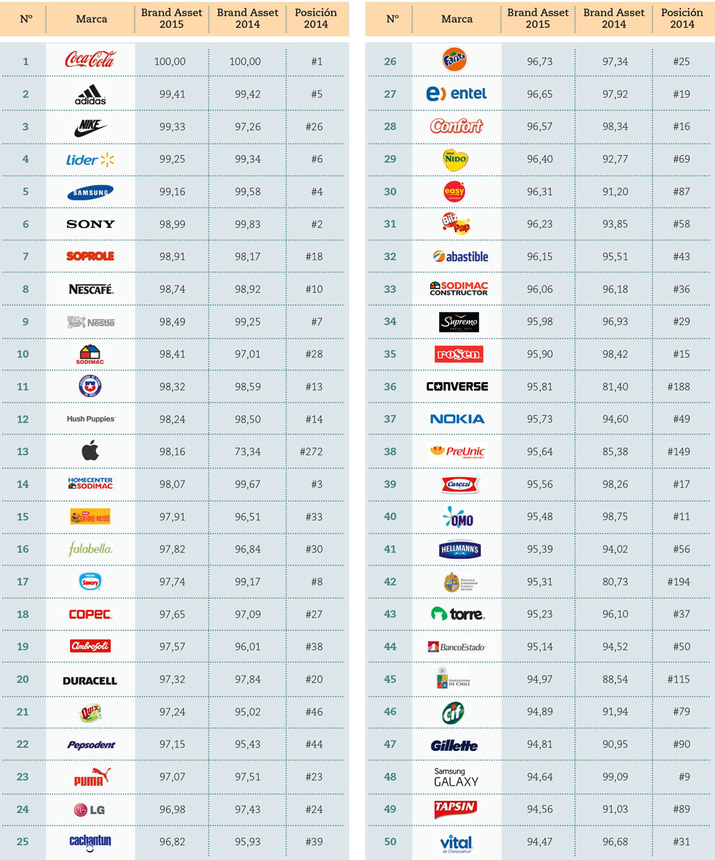 Of the 100 most valuable brands by Chilean in 2015, our brand Hush Puppies occupies the No. 12 position, having climbed two places from the No. 14 it had in 2014.